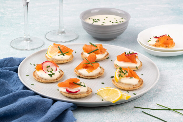 Tipp: Die Blinis können im Voraus zubereitet werden. Zum Aufwärmen locker in Alufolie wickeln und 7–8 Minuten bei 180 °C im Ofen erhitzen.