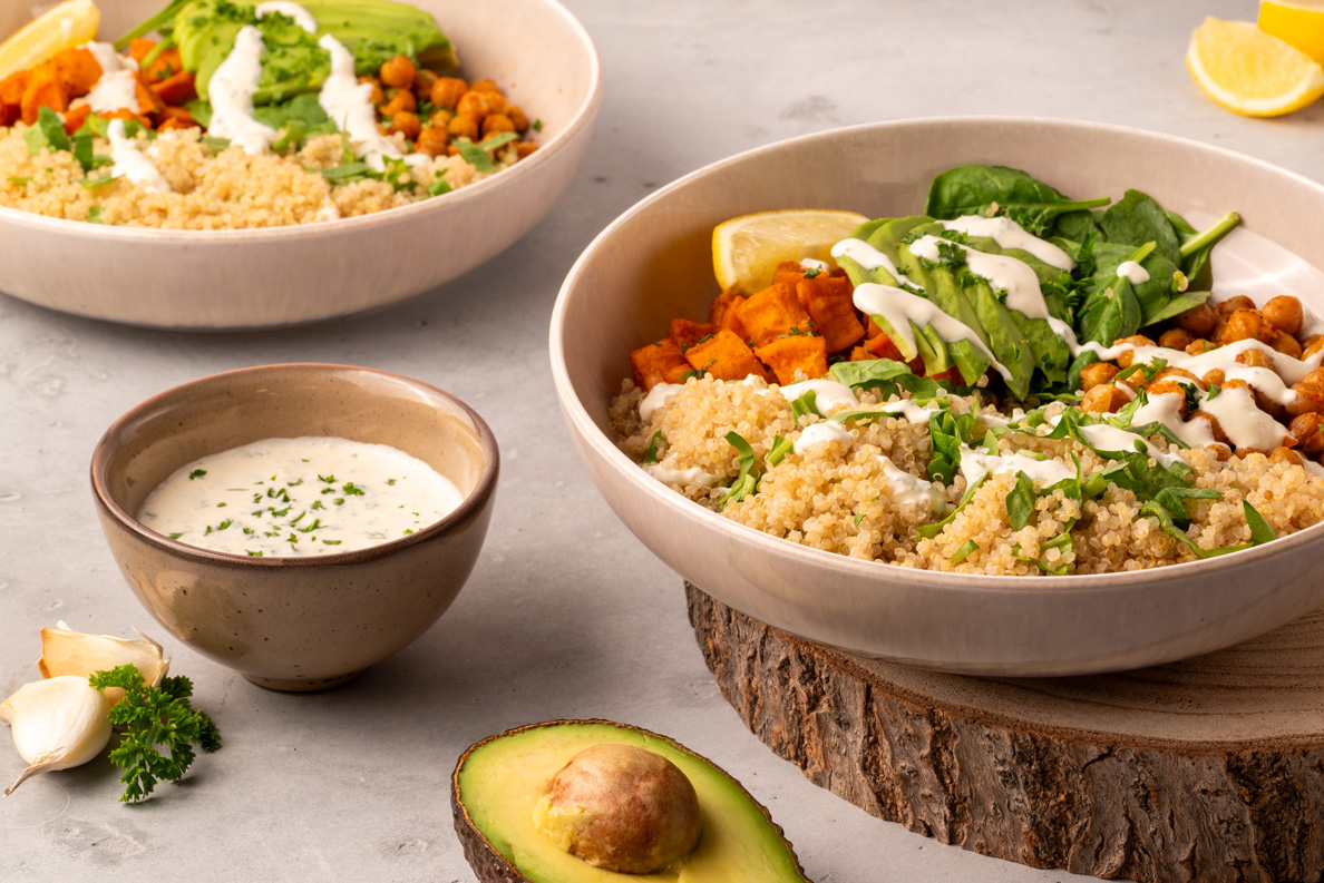 - Pour le dressage, incorporez les pousses d’épinards au quinoa encore chaud, puis répartissez dans deux bols. Garnissez de patates douces et de pois chiches rôtis, de tranches d’avocat, de quartiers de citron et de persil. Servez les bols accompagnés de la crème à l’ail.
